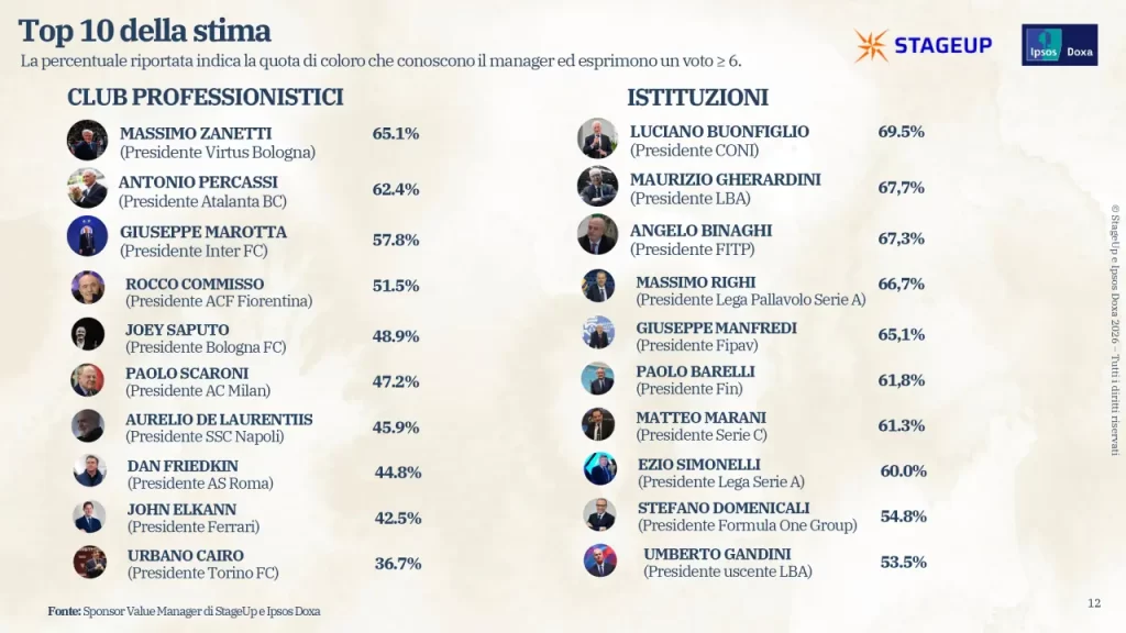 Gherardini - Il presidente della LegaBasket Maurizio Gherardini è il secondo tra i manager delle istituzioni II stimato, dietro solo a Luciano Buonfiglio, presidente del CONI (69,5% dei voti uguali o maggiori a 6). In questa classifica c'è anche un decimo posto per il predecessore Umberto Gandini.